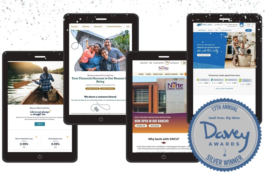 On the heels of one CUNA Diamond Award and three MAC Award wins, we’re thrilled to share that our clients Reliant Credit Union, Jeanne D’Arc Credit Union, Del Norte Credit Union, and USE Credit Union all won 2021 Silver Davey Awards for their website redesigns!